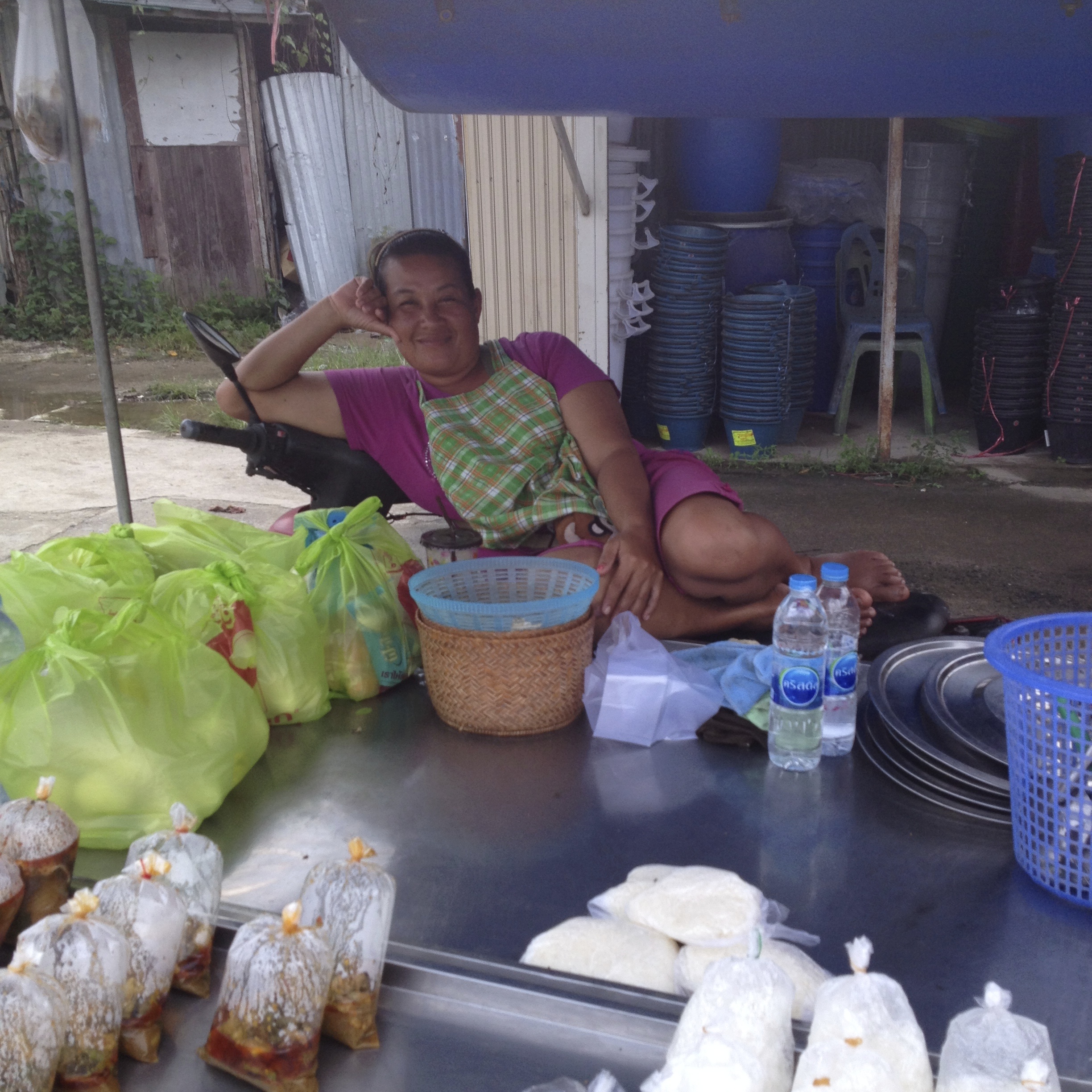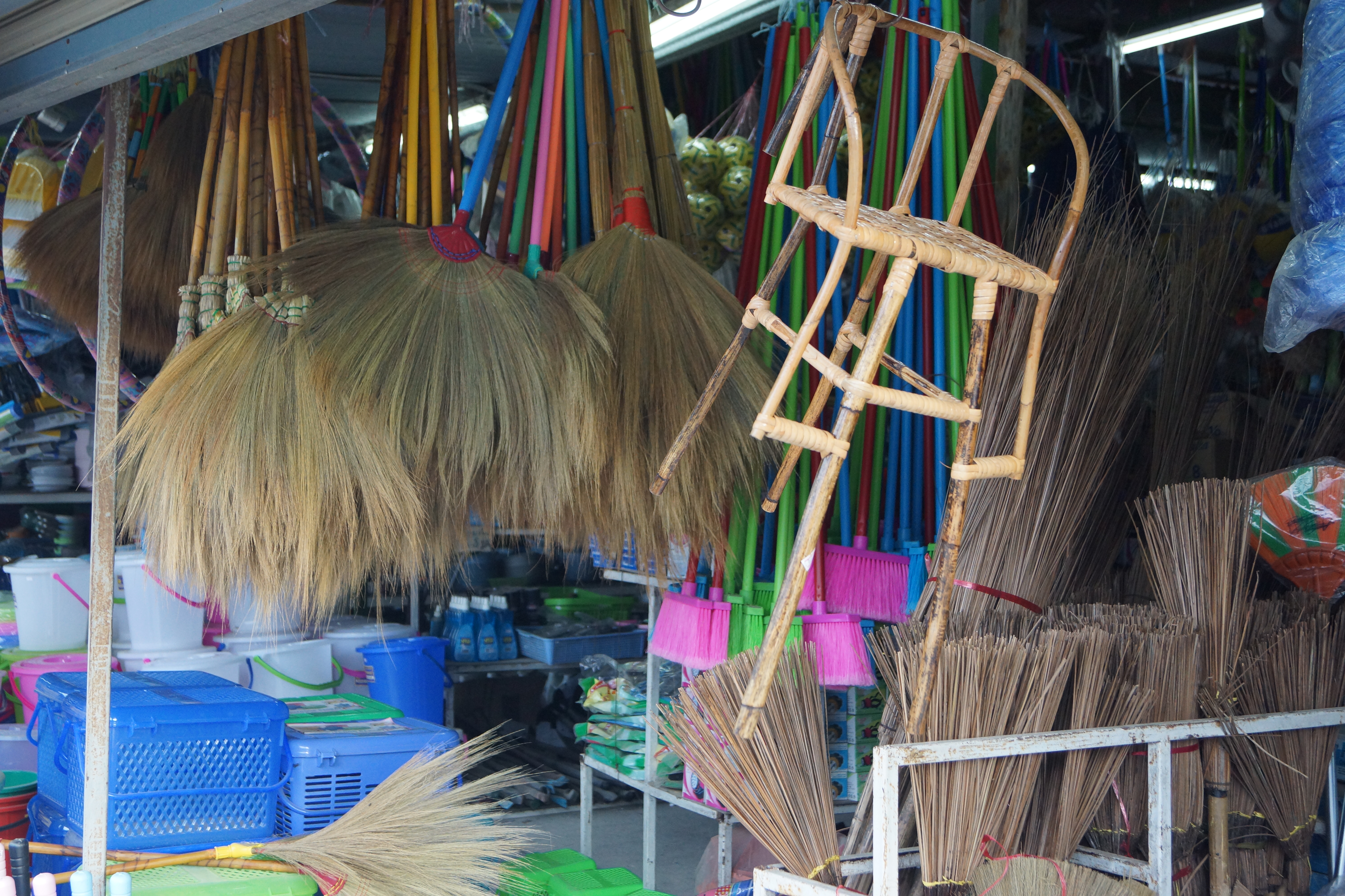 I passed the welcoming display; a hodgepodge of wispy brooms, sponges and spades, of dust pans in yellow, pink and blue. I noted tickly feather dusters, hoses, and hanging baby seats… wicker tightly bound. They perch precariously on many family ‘vehicles’, the ubiquitous scooter.