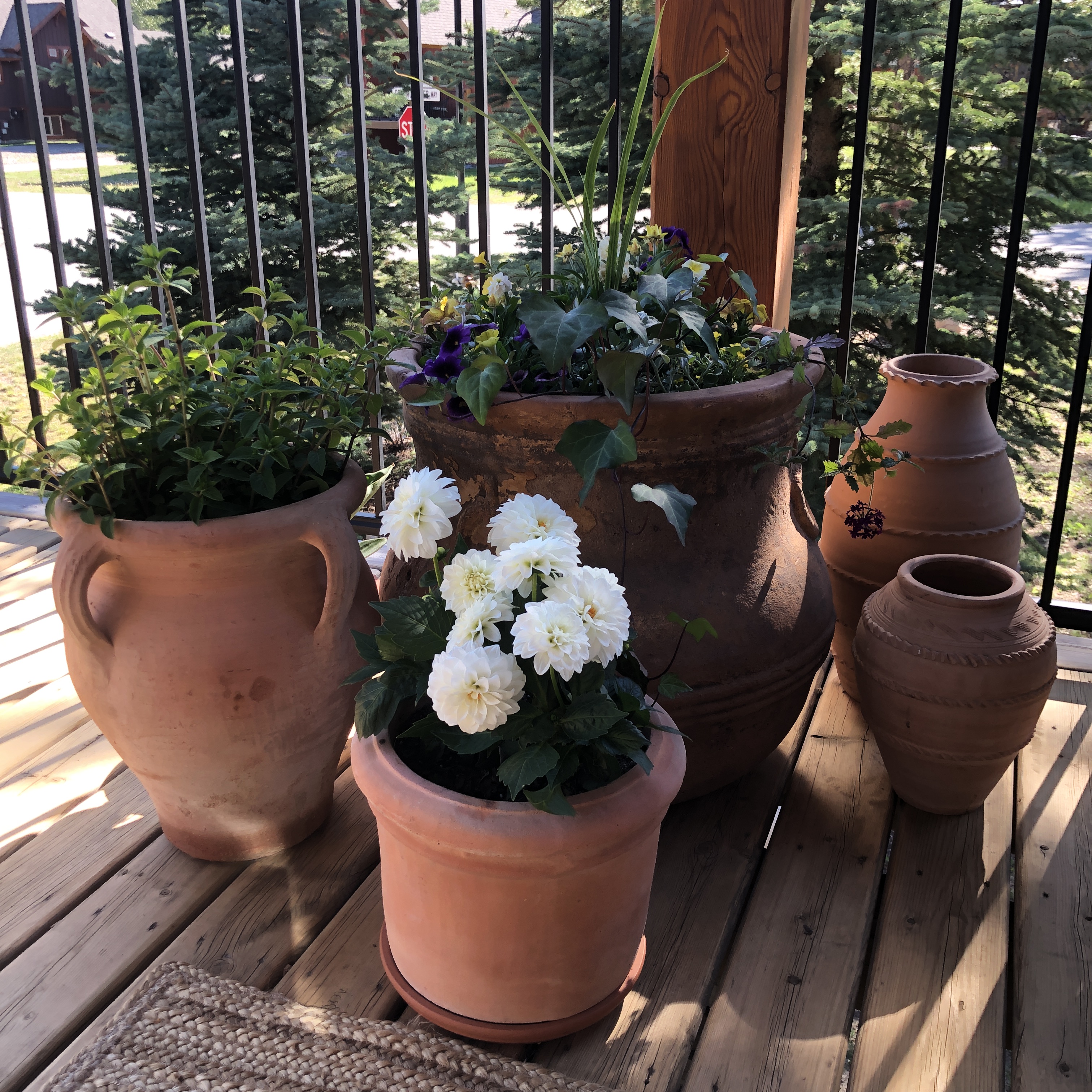 And it came together beautifully. Three potted cedars not only provide privacy, but are a mountain-nod to the tall cypresses of Italy. A basket from Thailand holds an emerald-green palm, its gentle swaying in the breeze transports me back to tropical Asia. Lemony delicate straw flowers, snap dragons and mauve petunias grow happily in a planter found in an Omani souk. Antique Japanese parasols are at the ready for shading. And my beloved India is heartily represented… in lanterns and cushions, by a wooden sculpture and a chunky Indian coffee table. With the ski hill as the deck’s backdrop, there’s a peaceful harmony of those places dear to me while still embracing this mountain space.